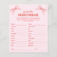 Add festive cheer to your celebration with this red and pink hand drawn bow Finish the Bride’s Phrase game, perfect for a Christmas bridal shower, winter wedding shower, or festive holiday gathering. A cute addition to a merry little bridal shower, this playful game lets guests guess the bride’s answers while enjoying cozy seasonal charm. Ideal for winter brides, holiday parties, and engagement events wanting a fun, lighthearted activity.