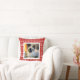 Rood en witte vakantie gooien kussen met een patroon van sneeuwvlokken, harten en molen. Voeg een foto van je huisdier toe!