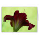 Kijk naar de achterkant van een rode Indy Rhapsodie overdag tegen de zonnige groene achtergrond. Floral afbeelding gevangen bij MTBobbins Daylilies.