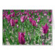 Paarse tulpbloemen tegen vers groen bladeren zijn een verbluffend en levendig gezicht. Paars wordt vaak beschouwd als de kleur van Royalty, en er is een zekere genade tussen deze bloemen. Al die maanden geleden zijn ze zorgvuldig geplant, nu prachtig in hun schoonheid en elegantie. Paars, levendig, kleurrijk en heel mooi. Prachtig voor iedereen die van paarse bloemen houdt en vooral van paarse tulpen. Aanpassen voor je eigen speciale bericht