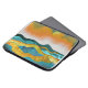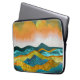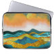 Abstracte landschapscène van een bergvista met rolheuvels en een regenachtig storm in oranje, goud, blauw en cyaan.