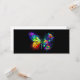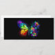 Regenboog, lichtgevende, artistiek geschilderde monarchvlinder met boeket van iriserende, heldere, lichtgevende rozen op zwarte achtergrond. Regenboogvlinder.