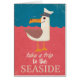 schattige cartoon op vakantie met poster. Reisposter van de zeemeeuw.