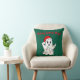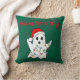 "Making Spirits Bight" coussin de vacances vert et rouge avec fantôme portant un chapeau de Père Noël et tenant des lumières de Noël