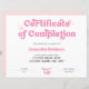 Trendy Certificate of Completion in blush roze met retro stijldoopvonten en ruimte voor uw bedrijfs logo. Ideaal voor creëer moderne voltooiingsuitreiking voor professionele welslagen, weduwen en andere schoonheidsbehandelingen. U kunt deze certificaattoekenning voor om het even welk type van professionele accreditatie gebruiken, eenvoudig de tekst uitgeven om uw behoeften aan te passen.
