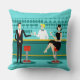 Elk uur is gelukkig met dit Retro Cocktail Lounge Sierkussen. Het moderne design uit de middelste eeuw is voorzien van een levendige stijl van 1960, minimalistische, cartoon tekening van een klasbare, cocktailbar. Tegen de achtergrond van een watermuur kunnen we rijen drink glazen zien. We kunnen tenminste de blauwgroen silhouetten van een drink bril zien. Afgaande op de vormen van de stengels, is deze bar goed uitgerust om uw fluitje te nat, ongeacht uw voorkeur voor drink. Een bekwame en persoonlijkste barman bemannen de blauwgroen bar met gele accenten. De jonge jachthaver draagt een pristine, wit shirt met zwart boegstropdas. Zijn frisse blik, blond haar en zwarte hipsterbril geven ons alle reden om te geloven dat hij zijn dagen doorbrengt als een worstelende acteur of een superheld. Aan de ene kant geeft de knappe mixoloog een martini aan een klant aan de andere kant van de balk. De wachtende klant is een breed gedragen heer in een zwart pak en rood stropdas. Hij is het soort man die beschreven wordt als groot, donker en knap zelfs als het nog uren is tot de sluitingstijd. Er lijkt een rode en chrome stool te zijn met de naam van de heer Debonair. Toch stelt hij, om niet te presumptief te zijn, de vraag: "Pardon, ik ben het niet eens. Is deze stoel genomen?" Hij vraagt aan de raven geharreerd meisje op de naburige stool. Ze is een echt "meisje van de volgende deur" type, als je naast een onberispelijke schoonheid leeft met een getal dat niet zal stoppen. Ze draagt een zwarte jurk en houdt met één hand een martini vast. Ze hoopt dat ze en de komende heer meer gemeen hebben dat hun voorkeur voor drink en de keuze van de wardrobe kleur. Het lijkt erop dat het vanavond net interessant werd. Proost op jou!