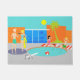 Kom binnen! Het water is prima. Deze Retro Pool Party Deuren Mat is voorzien van een levendige, cartoon tekening van een leuk en geavanceerd poolfeest. Het moderne design in het midden van de eeuw draait rond een rond zwembad op een grote, grijze, betonnen terrasse aarde. Het zwembad is gevuld met turkooiswater. Oranje metselwerk omringt het zwembad en er is een witte, plank duikplank klaar voor een avontuurlijke ziel. Een rode en witte strandbal drijft in het water. Aan de andere kant van het zwembad hangen twee partijgoeren hun voeten in het water, terwijl ze rusten op rode en witte gestreepte strandhanddoeken. De vrouw met zwart haar draagt een roze, één stuk zwempak. Naast haar is ze een tropische drink in een kokosnoot met een kleine paraplu en een groen rietje. Het blonde man draagt heldere, groene boomstammen. Hij wordt geschopt met zijn handen achter zijn hoofd. Links van het zwembad staat een vooraanstaand man met wit haar en jade zwemmen met een drink in een kokosschelp. We weten dat hij zich onderscheidt omdat hij een man is met wit haar! Hij praat met een vrouw met een blond haar en een houtsglas figuur met een turkooiswimpak. Slung over haar arm is een gele strandhanddoek. Achter deze scène zit het groene silhouet van een palmboom en een futuristisch, oranje, baksteenhuis. Door de grote, vloer tot plafond, blauw glazen ramen, zie je het silhouet van een televisie, stoel, ottoman en sterrenklok. De hemel achter het huis is een wolkenloze turquoise met een ronde, gele zon. De tegenovergestelde kant van de kussen heeft een oranje baksteenpatroon.