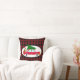 Een kussen met een koele oude rode auto met een groene kerstboom op zijn dak en een cadeau dat in de open kofferbak weggehakt is. Heeft een mooie retro-vijftierachtige flair. Rode buffelpleister achtergrond.