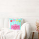 Koel kussen op de voorkant bedrukt met pastelkleurige retro lolly's over aqua blauwe strepen, de blauwe strepen bedekken ook de hele achterkant