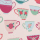 retro theekopjes in pastelroze, blauw, groen en rood op een blush roze achtergrond. Originele kunst van Nic Squirrell. Perfect voor uw keuken, eethoek, restaurant, theekamer of café.
