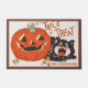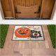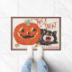 Deze schattige Halloween deurmat heeft een afbeelding van een zwarte kat die krijst bij een grijnzende jack-o-lantaarn pompoen met de woorden "Trick or treat". Personaliseer door jouw namen of speciale tekst toe te voegen.