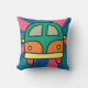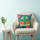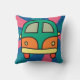 Helder en leuk kussenontwerp met een retro bestelwagen in levendige kleuren op een psychedelische achtergrond. Perfect voor het toevoegen van een vleugje nostalgie en hippie-vibes aan elke ruimte.