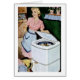 Een retro 1950s huisvrouw in haar roze jurk en blauw en wit gerimpeld apron glimlacht net zoals ze het wasgoed van het gezin in haar moderne wasmachine doet. Er ligt nog een volle mand kleren in haar wachten op de vloer. De binnenkant van de kaart zegt: "Soms is het succes dat de was in de droger terechtkomt voordat de modew in de machine gaat."