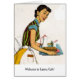 Een retro-huisvrouw in haar jurk en apron beamt een grote glimlach omdat ze een dienblad met taart en koffie draagt om iemand te dienen die volgens haar een beetje slecht karma verdient! Ze zegt: "Welkom bij de Karma Cafe! Er zijn geen menu's. Je zult worden gediend wat je verdient."