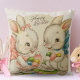 Pillow heeft een illustratie van een meisjesbunny, in een roze boog, en een jongetbunny. in een blauwe boeg, met kleurrijke paaseieren voor levering met de woorden "Happy Easter" hierboven geschreven. Achtergrond is een faux crèmekleurige linnen textuur.