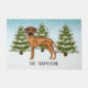 Destei's originele cartoon illustratie van een schattige Rhodesian Ridgeback rashond. De hond is geplaatst in een winterscène met drie groene sparren en vallende sneeuw. De achtergrond is een blauw tot wit verloop dat het ontwerp geeft dat koude winterdag eruit ziet. Er is ook een personaliseerbaar tekstgebied voor een naam.