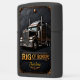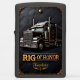 This dark, commanding, and rugged design is a powerful tribute to the heavy haul trucker and the transportation professional driving the "Rig of Honor." The centerpiece is a detailed, three-quarter frontal view of a classic semi-truck pulling a large, enclosed container box trailer. The rig is rendered in a polished dark metallic silver and black finish, accented with subtle golden details on the body and trim. The imposing front grille, powerful bumper, and tall dual exhaust stacks convey immense strength, industrial power, and magnitude. The truck is dramatically centered on a dark, textured road surface. The entire visual is framed by subtle golden scrollwork at the corners and base, giving the piece a prestigious and honor-bound feel. The truck's design emphasizes its role in long-distance logistics and commercial transport. The bold text "RIG OF HONOR" is prominently displayed, celebrating the trucker's dedication, power, and authority in managing the vital flow of goods. The artwork is set on a matte black lighter casing. The design may look real due to the high detail in the artwork.