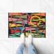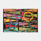 Dit portret heeft een modern ontwerp uit de midden eeuw van driehoeken en ringen in retrokleuren op een zwart veld.