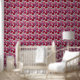 Rode rozen, bordeaux pioenen en lavendel lila maken samen een mooi, lief en romantisch, groot print behangpatroon.