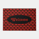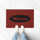 Trendy deurmat bedrukt met rode en gouden Chinese papieren dansfans op een zwarte achtergrond.