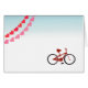 Een schattig ontwerp met een rode fiets met een rode stoel en een rood lijst, zwarte pedalen en zwarte banden. Een zachte blauwe achtergrond met een reeks harten in de hoek.