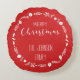 Rood Vrolijk kerstkussen met witte bladeren decoratie en veranderlijke tekst - u kunt uw familienaam toevoegen, gedrukt op rode achtergrond