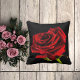 Een prachtige rode roos met waterdruppels op een zwarte achtergrond foto gooit kussen.