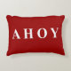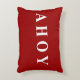 Elegante, eenvoudige, moderne en trendy rode en witte zeiling of bootontwerplumbool of -gooi kussen of kussen met een rode achtergrond en witte tekst of typografie "Ahoy" aan de ene zijde en rode en witte strepen aan de andere zijde. Dit hedendaagse elegante ontwerp voor accenten of kussens zal elk thuis, strandhuis, slaapkamer, sofa, woonkamer, kantoor of boot verbeteren.