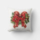 Een kussen met een feestelijke kerstboog in rood en goud. Omgeven door poinsettia bloemen, dennen en kerstversieringen.