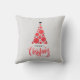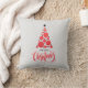 Kerstboom van rode ballen en zwarte sterren en de begroeting MERRY CHRISTMAS zijn te zien op dit kussen met een lichtgrijze achtergrond (kan worden veranderd in elke kleur.) OVEREENKOMENDE objecten in ons collectie.