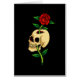 Een klassiek tattoo-afbeelding van een schedel met een rode roos die erdoorheen groeit.