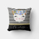 Roos goud kat prinses monogram kussen. kattenprinses in roos goud, wazige roze en goudglitter, roze hartvormige neus en grote gouden glitteroogwriemen, met een kroon en blauwe bloem. Zwart-witte lijnen gestripte achtergrond met gouden lint. Pas eenvoudig jouw naam aan en voeg deze toe om de kussen aan te passen.