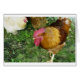 De struikroster kijkt in fijne vorm en kleur over de hennen. Aanpassen voor "Jaar van de Rooster Baby", "Mijn nestei kan niet eens een omelet maken" of "Tel je kippen niet"
