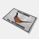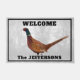 Een mooie roosterfazant wordt op een gevlekte achtergrond van bomen geplaatst.