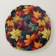 Dit ronde vorm accent kussen wordt getoond in een mooie kleurrijke herfst bladeren print pixabay.