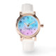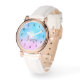 Een horloge met een grillige achtergrond. Een kleurenschema voor pastelroze en blauw verloop. Kleine witte sterren verspreid rond. Waanzinnig en magisch ontwerp.