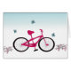 Een schattig ontwerp met een roze fiets met een roze stoel en lijst, zwarte pedalen en zwarte banden. Een zachte blauwe achtergrond met kleine blauwe vlinders die over vliegen.