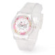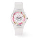 Een horloge met een illustratie van een roze fiets. Personaliseer met jouw naam. Achtergrond is patchwork geïnspireerd ontwerp met gingham, polka dot, chevron zigzag, strepen, paisley en bloemmotieven.