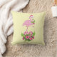 Een kussen met een tropische kerstflamingo met een roze santa-hoed. Onder zijn voeten bevindt zich een snoepriet met tropische bloemen en roze bessen. Een hol op zijn borst.
