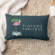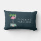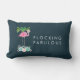 Kussen met een illustratie van een roze flamingo met groene palmbomen achter en staand op een bed van bloemen succulente bloemen. Tropisch en . De achtergrond is donkerblauw. Tekst zegt Flocking Fabulous.