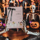 Schattigee Halloween thema verjaardagsfeestuitnodiging met een zwarte boog en spoken.