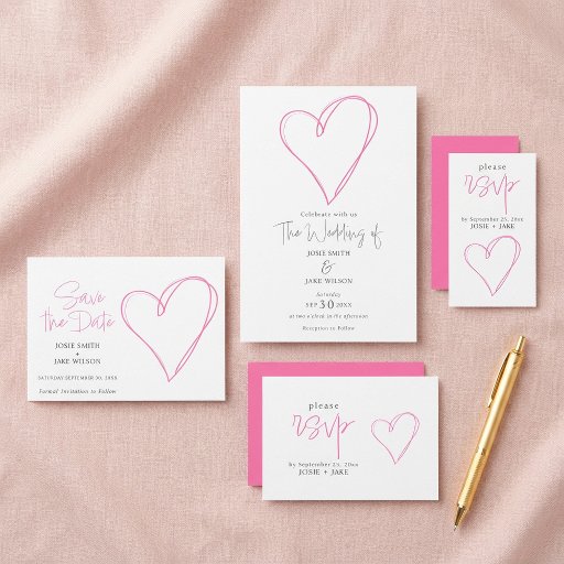 Vier je aanstaande bruiloft met een moderne save the date-kaart met een fel roze liefdeshart in een charmante, lijngetekende stijl. Elegante typografie en een minimalistische lay-out creëer, een romantische en verfijnde eerste indruk, die schoonheid en romance perfect combineert met opwinding en anticipatie. Warme roze tinten en zachte neutrale accenten zorgen voor een eigentijdse sfeer, terwijl het eenvoudige, minimalistische ontwerp de oprechte aankondiging van uw speciale dag benadrukt. Deze verfijnde kaart legt de essentie vast van een romantisch en elegant feest, waarbij moderne stijl, een vleugje charme en de vreugde van het delen van uw huwelijksnieuws met geliefden worden samengebracht met behulp van een helder save the date-concept, versterkt door een kenmerkend roze hart.