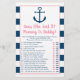 Die leuke gok die zei dat mama of papa spelkaarten een leuke Baby shower zijn. Geef ze gewoon door tijdens het Baby shower, waar gasten plezier zullen hebben in het vertellen van wie ze elke uitspraak hebben gezegd: mama of papa. Dit schattige nautische ontwerp is voorzien van een schattig anker met een hartelust.