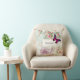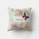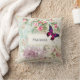 Een gepersonaliseerd kussen met een elegante roze magenta vlinder met paarse accenten. Een wit lijst met een goudkleurige rand is gelaagd over een armoedige collage met roze rozen en andere sierelementen. Een chique ouderwetse sfeer.