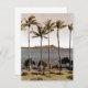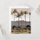 1940 een handgekleurde foto die het beroemde Diamond Head van Hawaii weergeeft door een grove palmbomen. Op de achtergrond zien we een hotel, een paar zeilboten en witte zeilboten die golven breken.