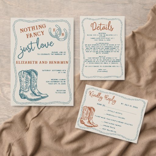 Simple rustic hand-drawn western-style wedding design featuring a rope frame, cowboy boots with a hat, and two horseshoes with customizable initials. Perfect for barn weddings, ranch weddings, country-themed celebrations, fall weddings, or minimalist rustic nuptials.