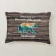 Decorator gooit kussen voor de familie berg/wildernis thuis. Een beer met groene bergen en een kompas zit op een roestbruine achtergrond. tekst zegt: "Welkom in onze nek van de bossen." Pas verder aan uw familienaam en de locatie van uw huis aan.
