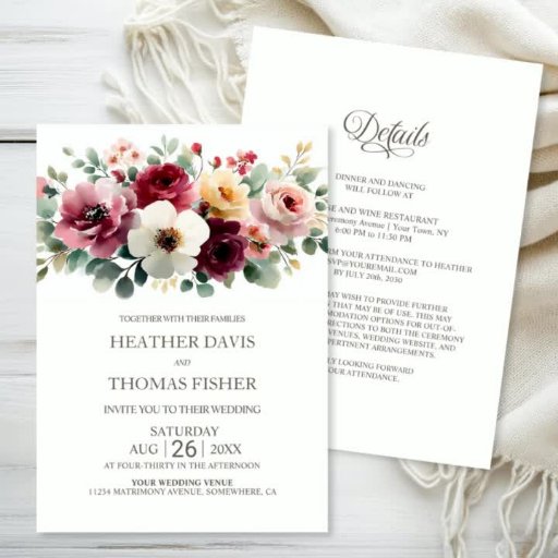 Nodig je vrienden en geliefden uit om je vereniging te vieren met deze Bourgogne bloemenbruiloft uitnodiging. Met de aanpasbare tekst kunt u moeiteloos de namen van de bruid en bruidegom, de trouwdatum en de nodige details van uw feest toevoegen. Een verscheidenheid aan papiersoorten en hoekstijlen zijn beschikbaar voor uw unieke uitnodigingen, samen met de optie om te downloaden als u de voorkeur geeft aan een digitaal formaat.