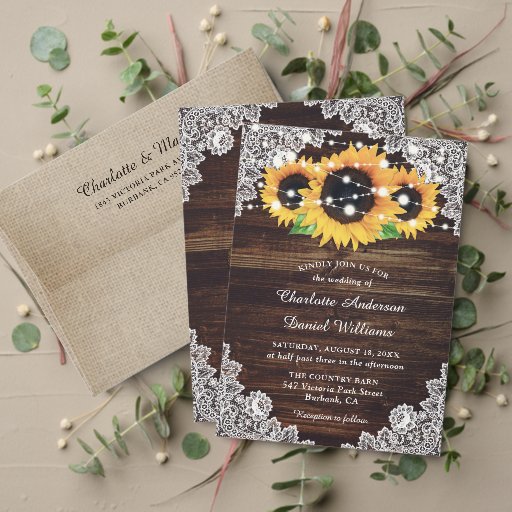 Cartes RSVP de mariage rustique personnalisées avec tournesol, burlap, dentelle et bois de grange. Un design de carte parfait pour compléter votre pays rustique, ou la fête de mariage de grange inspirée des fleurs de tournesol. Objets correspondants disponibles pour compléter ces cartes RSVP de mariage rustique chic.