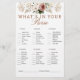 This rustic floral “What’s In Your Purse?” bridal shower game adds a playful and personal touch to your celebration. Guests score points by checking off items they carry, from lipstick to loose change!